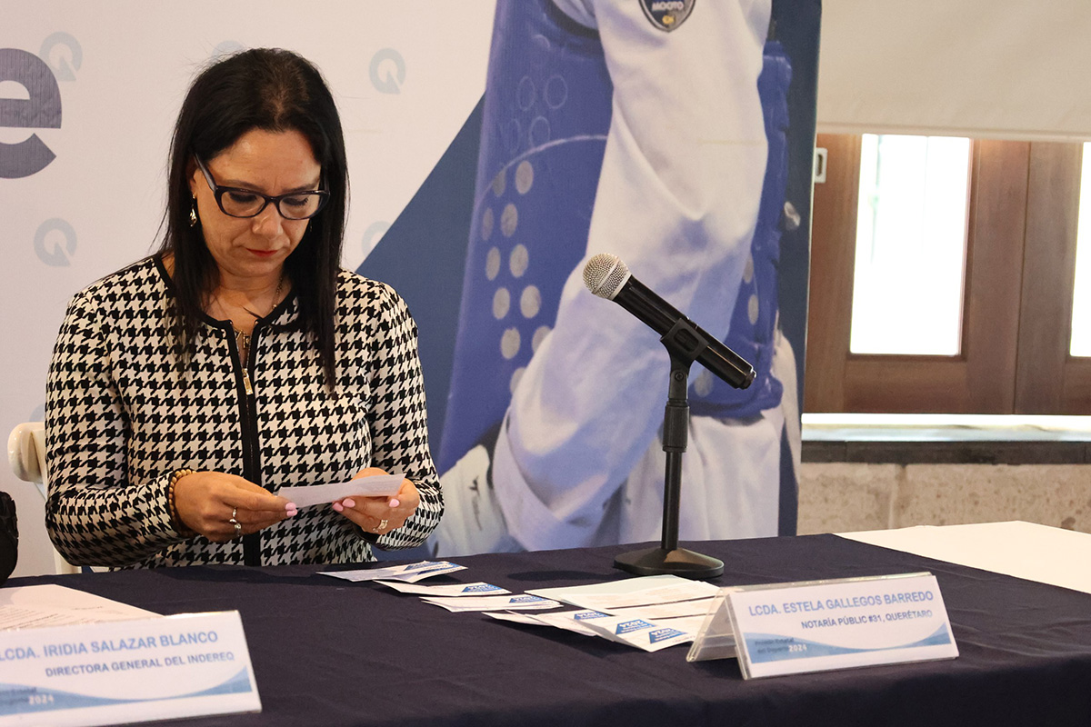 La directora general del Instituto del Deporte y la Recreación del Estado de Querétaro (INDEREQ), Iridia Salazar Blanco, presidió la ceremonia en la que se anunció los resultados del Premio Estatal del Deporte 2024 en sus cinco categoría.